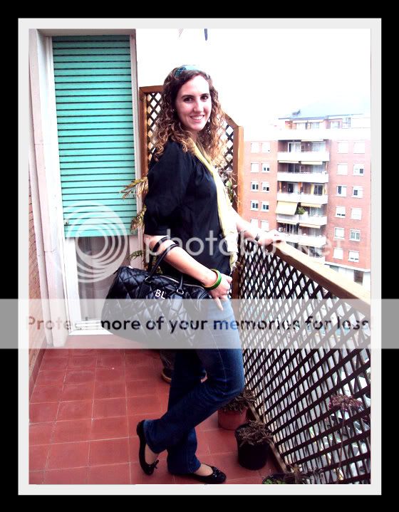 Vintage Nechace, scarf, diadem and blouse, Zara's Blazer; Marité François Girbaud's jeans, Bimba & Lola's bag, Geox's shoes.